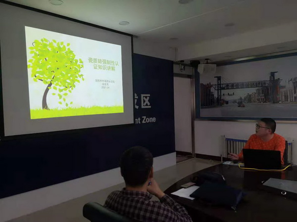 通过调研,认证监督管理处张宏亮了解到法库陶瓷行业和基层市场监管人员对强制性产品认证知识匮乏,制作了PPT,4月22日下午在法库开展了《瓷质砖强制性认证知识讲解》。他主要从强制性产品的概念、目录、瓷质砖产品描述与界定、认证规则、认证程序等相关内容进行了培训,22 家企业和市场监管人员参加了培训。收到了良好的效果,大家现场就有关问题进行了提问。