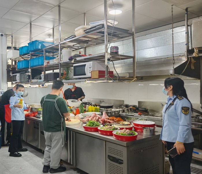民以食为天,食以安为先。餐饮企业是重中之重。执法人员检查多家餐饮单位,深入后厨,对食品储存、加工流程、餐具消毒情况以及食材采购台账、从业人员健康证明等方面开展全面检查。在检查中发现“食材存放未分类”“消毒记录填写不及时”等操作不规范问题,执法人员当场向企业负责人指出,并耐心讲解食品安全操作规范,要求立即整改,确保食材采购、加工、出品的每一个环节都符合食品安全标准,确保舌尖上的安全。