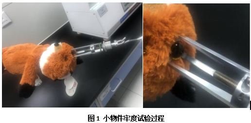 此项目考核的是毛绒、布制玩具中的塑料小物件装配牢度。毛绒玩具中常会用到装饰用的珠子和金属片等,这些都是容易被厂家忽略的“小细节”,如果附件不够牢固,在拉扯过程中附件脱落,而脱落的小附件被孩子误食后,可能引起窒息、造成严重伤害。