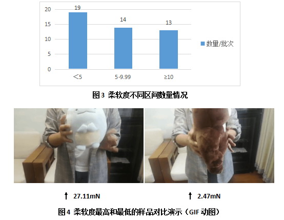 毛绒玩具的柔软程度也是消费者较为关心的重要指标,但玩具的柔软程度喜好较为主观,因此仅对样品的柔软程度进行对比。本次比较试验参照压缩回弹的原理,毛绒玩具在压力值一定的情况下,根据有效接触面积和变形尺寸,计算柔软度,计算公式为:柔软度 = 压力值 X 形变尺寸 / 有效面积。实验结果显示,柔软度在0.31mN~30.57mN之间,柔软度值的分布区间如图3所示,柔软度最高和最低的对比情况如图4所示: