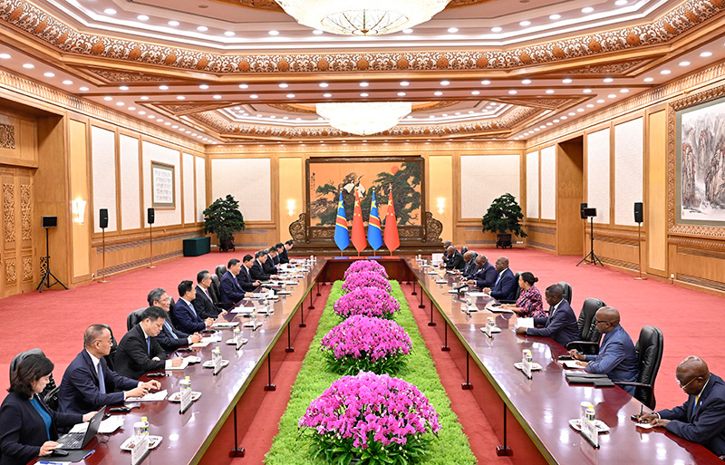 9月2日上午,国家主席习近平在北京人民大会堂会见来华出席中非合作论坛北京峰会的刚果(金)总统齐塞克迪。新华社记者 殷博古 摄