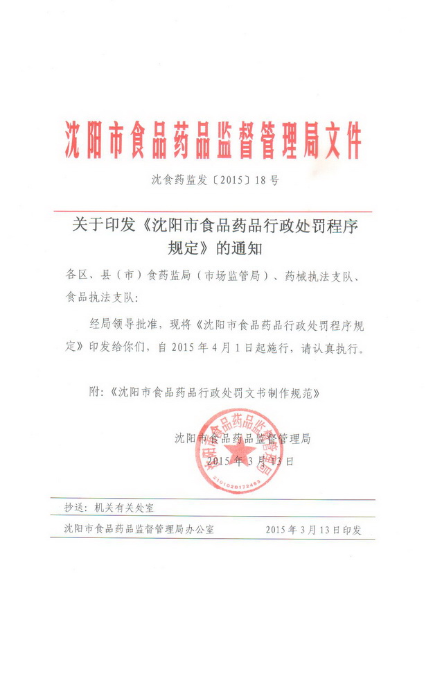 关于印发《沈阳市食品药品行政处罚程序规定》的通知