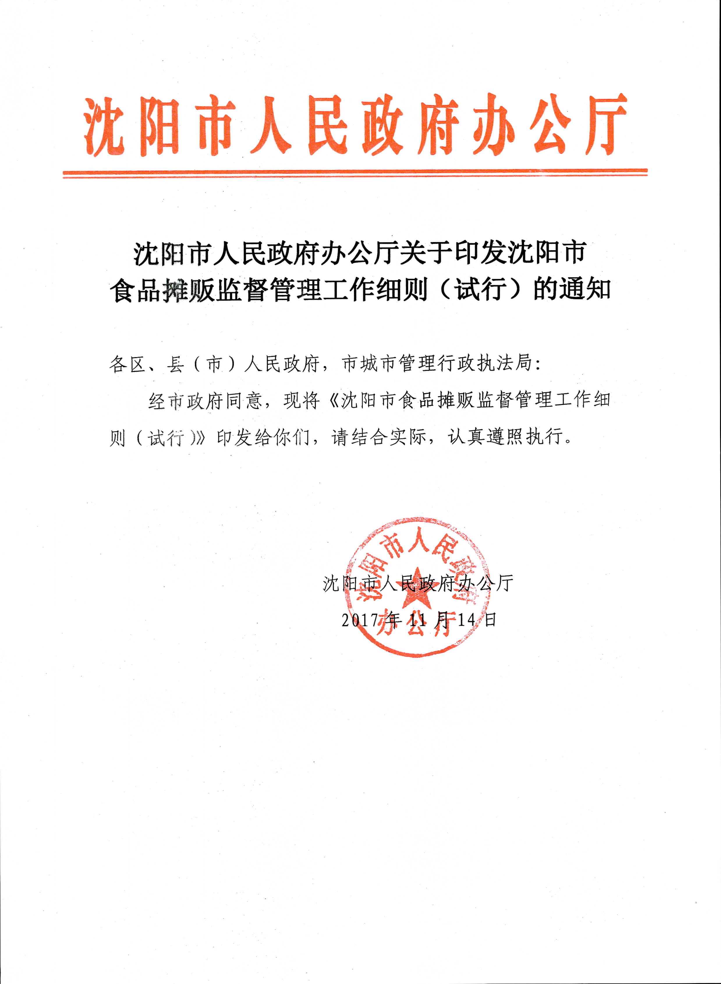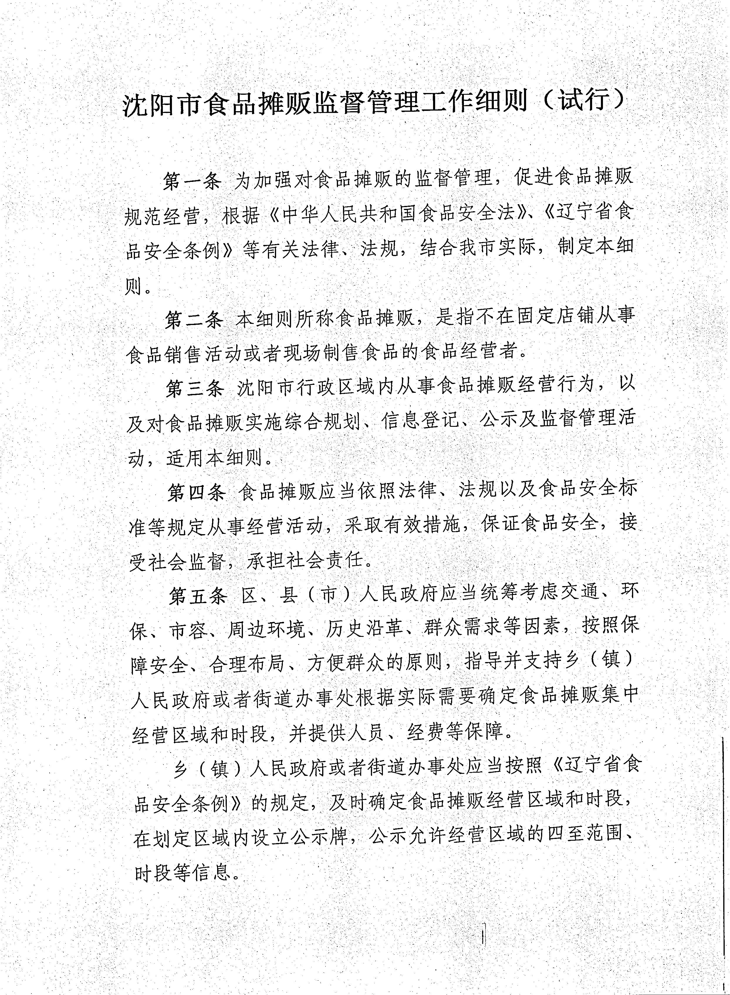 关于印发《沈阳市食品摊贩监督管理工作细则(试行)》的通知