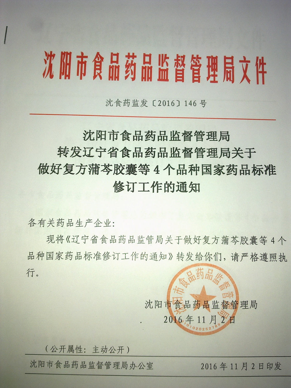 转发辽宁省食品药品监督管理局关于做好复方蒲芩胶囊等4个品种国家药品标准修订工作的通知