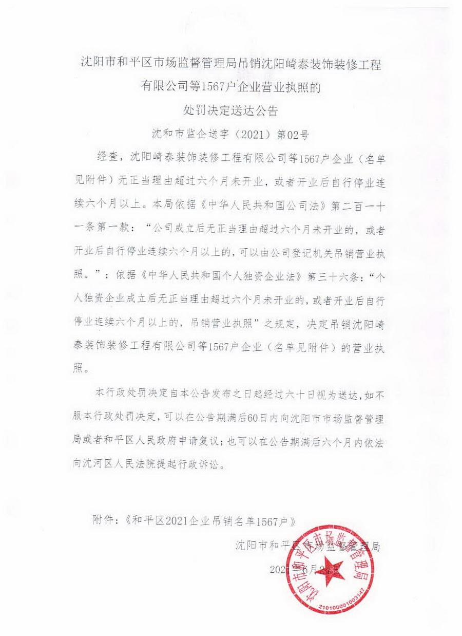 沈阳市和平区市场监督管理局吊销沈阳崎泰装饰装修工程有限公司等1567户企业营业执照的处罚决定送达公告(沈和市监企送字〔2021〕第02号)