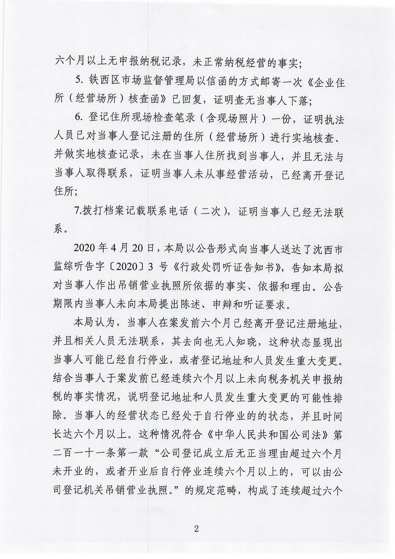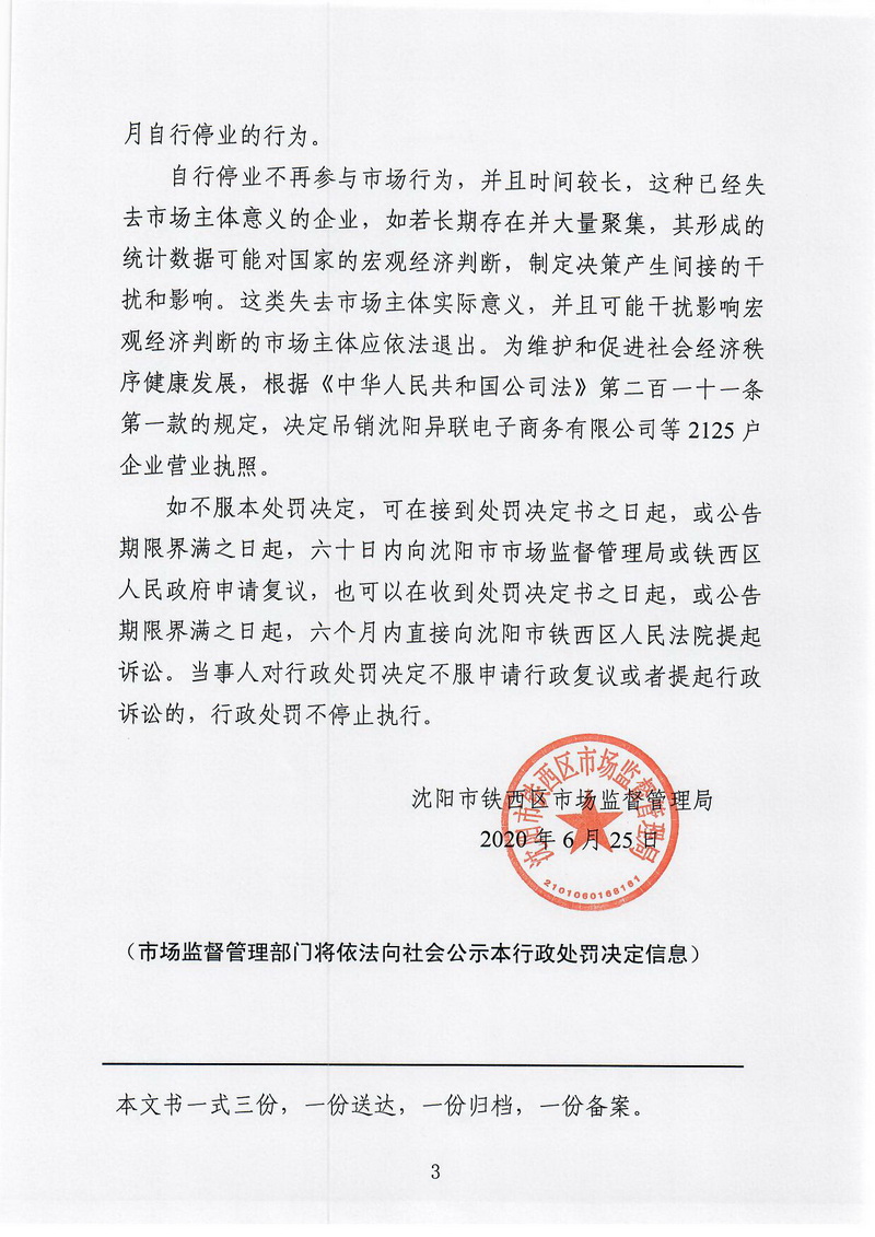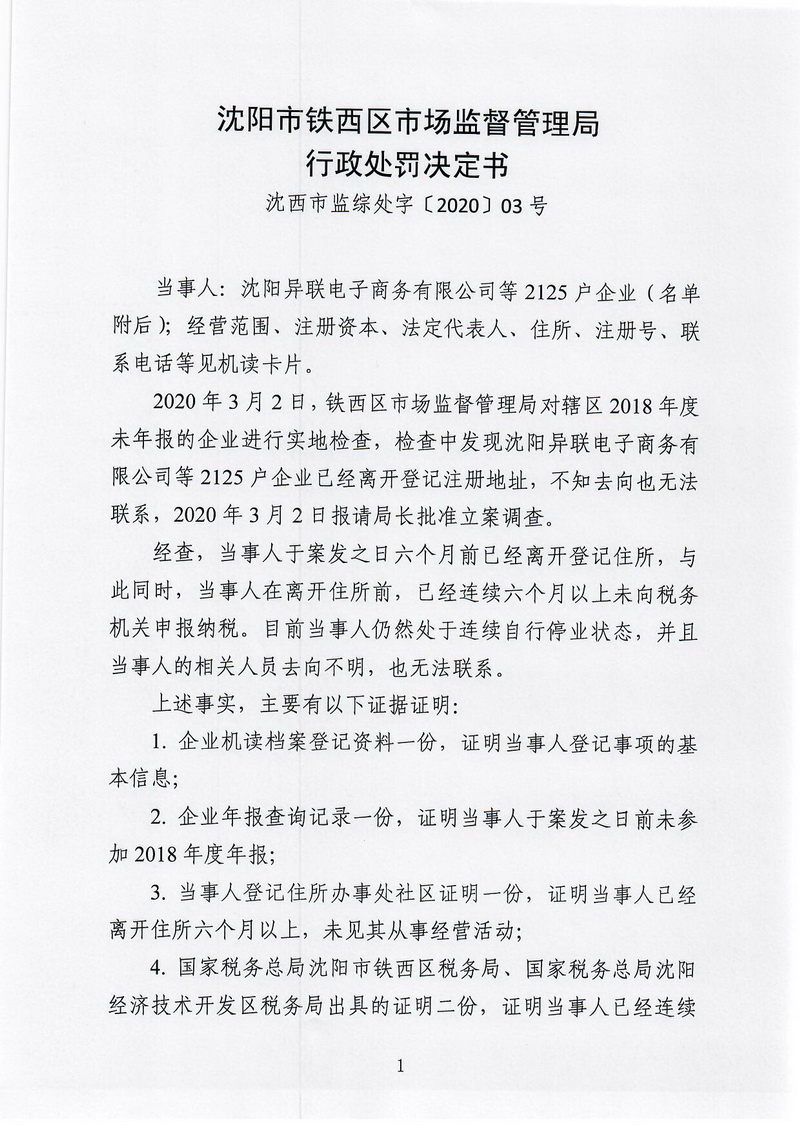 沈阳市铁西区市场监督管理局行政处罚决定书(沈西市监综处字〔2020〕03号)