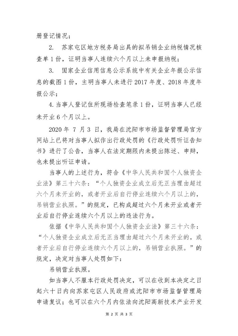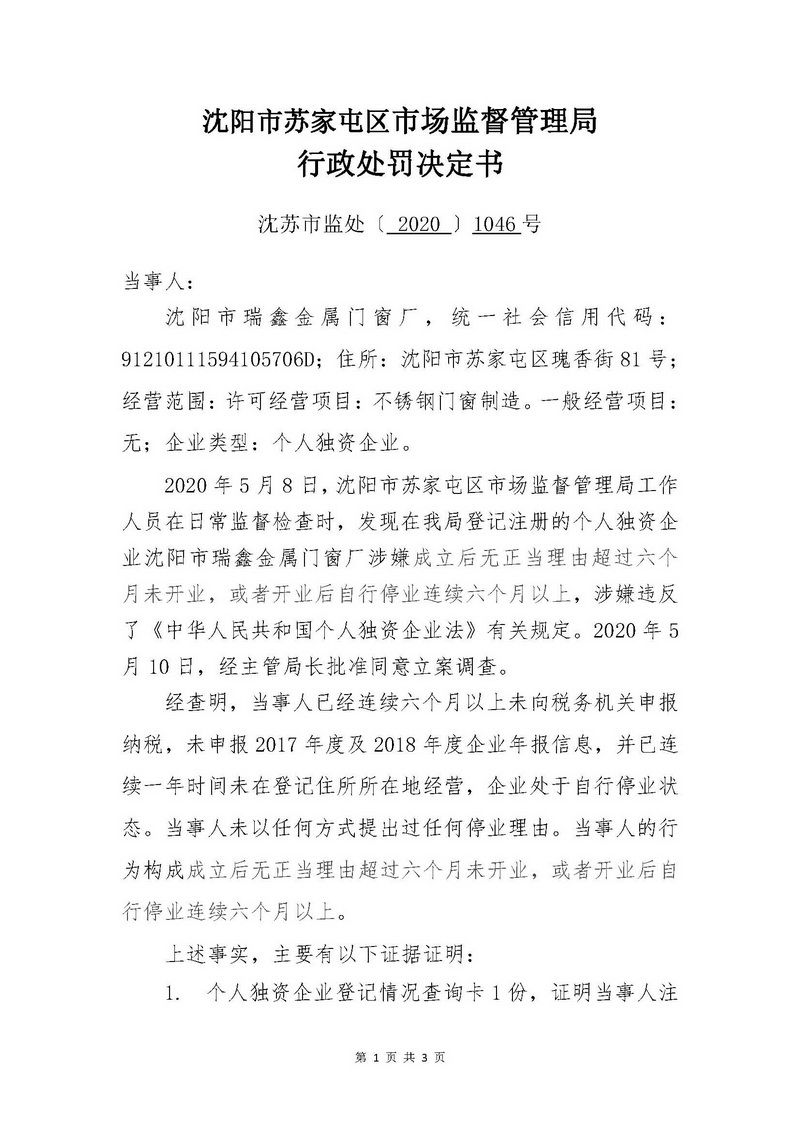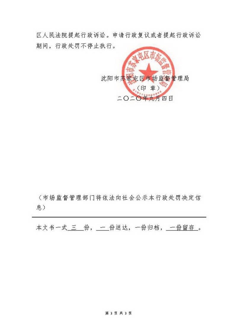 沈阳市苏家屯区市场监督管理局行政处罚决定书沈苏市监处〔 2020 〕1046号