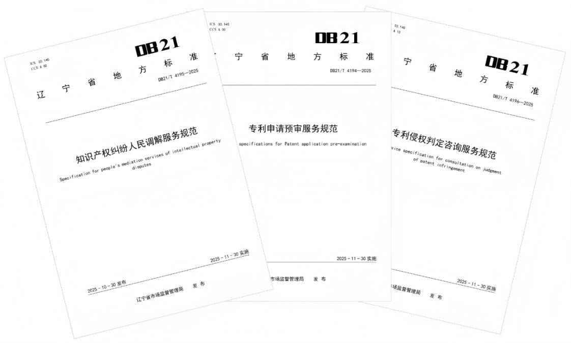 由沈阳市知识产权保护中心(沈阳市知识产权服务促进中心)、辽宁省检验检测认证中心(辽宁省标准化研究院)、辽宁省知识产权保护中心、大连市知识产权保护中心和沈阳市市场监管事务服务中心(沈阳市检验检测中心)牵头组织制定的辽宁省地方标准《知识产权纠纷人民调解服务规范》、《专利申请预审服务规范》、《专利侵权判定咨询服务规范》于2025年11月30日实施。